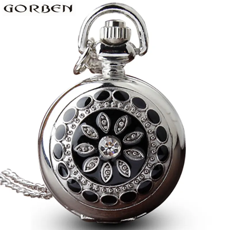 Name: Collar de plata con patrón de flores para mujer, con diamantes, reloj de bolsillo de cuarzo, colgante, cadena, reloj, colgante